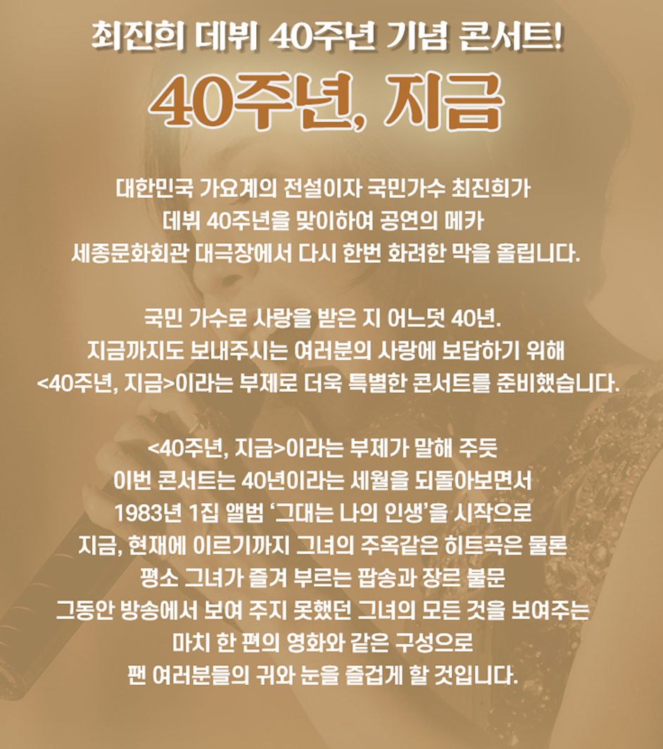 심수봉, 주현미와 함께 80년대 트로트 시대를 열었던 최진희가 데뷔 40주년을 맞아 단독 콘서트를 연다고 합니다. 추억속의 목소리를 들으며 가을밤을 정겹게 보낼 준비하시며 최진희 콘서트 일정, 예매방법, 가격을 확인하시기 바랍니다. 포스팅 하단에 할인쿠폰 정보도 있으니 끝까지 내용을 살펴보시기 바랍니다. 빠르게 예매하고 싶으신 분은 바로 아래를 확인해 주세요.